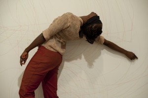 But the other, Taisha Paggett’s lyrical, dance-like drawing performance “Decomposition of a Continuous Whole,” was outstanding. The young Chicagoan worked blindfolded and barefoot, drawing her way around the gallery’s perimeter with crayons, sometimes stretching up on tiptoe, sometimes lying on the floor. Over the course of the evening, a looping abstract line drawing in a rainbow of colors emerged on the walls of the gallery as Paggett slowly, fluidly, carefully felt her way around the gallery, pacing off steps to ensure her lines traced or echoed each other in the drawing. Visible to all but blind to her viewers, Paggett’s performance tackles issues of the male (and female) gaze on a female model or in art featuring a woman; here, the artist is her own exotic product. Sadly, without the performance, the drawing is a somewhat empty piece of documentation.