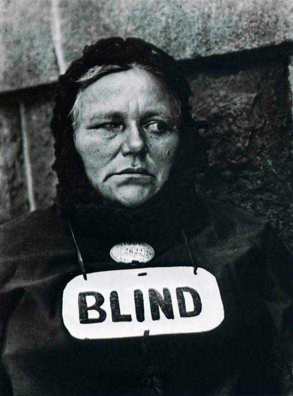 From a semiotic point of view, the sign reads like a label that reduces her identity to the visual perception of those who have the power to observe her. In this sense, the sign is as much an accusation as a proclamation, suggesting that the voyeur who “sees” her is blind to her humanity. Compounding the dehumanizing effect is the peddler’s badge, which diminishes her dignity as well as her identity, since peddling was all too often a euphemism for begging. She is not an individual, but a member of a marginalized, stigmatized, ostracized group, as if she were Jew in Nazi Germany with a gold star on her sleeve.
