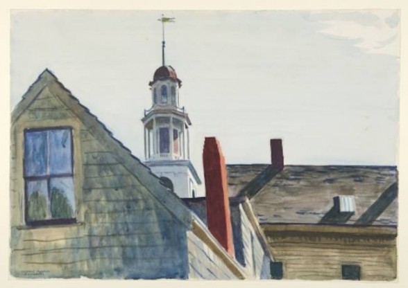 Winslow Homer was the greatest American watercolorist. Edwin Hopper’s Universalist Church is the most majestic work in the show and its poster. Childe Hassam represents Impressionism. Impressionism, even more than the Pre-Raphaelite, is good in watercolor. Today Geoffrey Hendricks does watercolors of the night sky while Claes Oldenburg does blueberry pie.