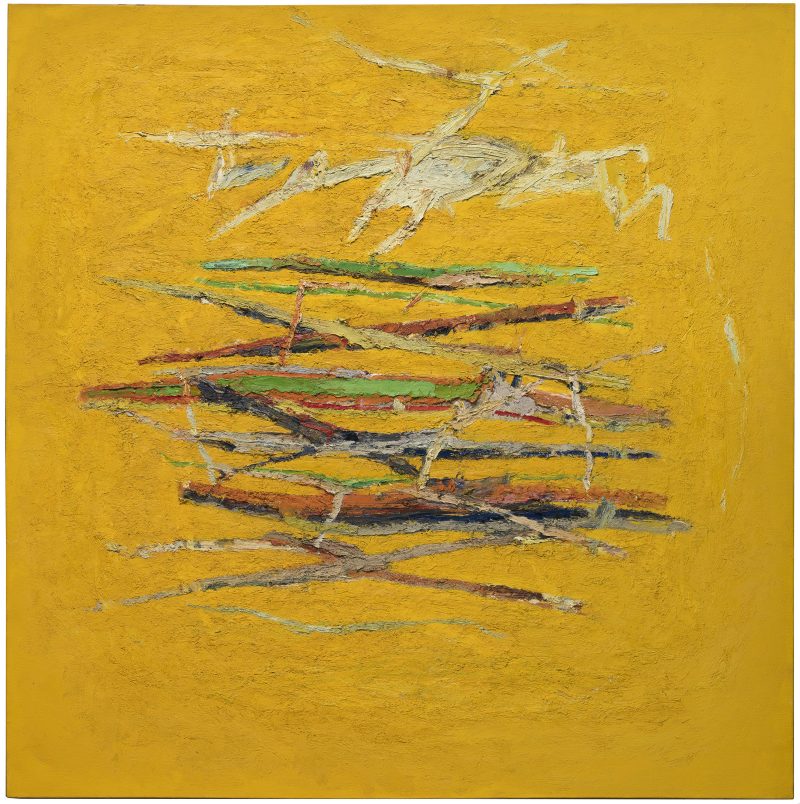 The curators wisely began the exhibition out of chronological order, which they otherwise followed, with work done from 1958–69, plus a large final installation which the artist created as a response to the Hirshhorn’s unusual, doughnut-shaped plan. The first painting visitors encounter is one of the seductive works from 1969, on a shaped, circular piece of acrylic which is positioned away from the wall.