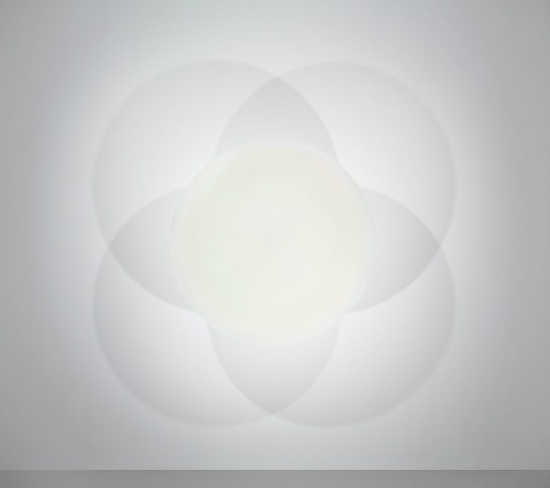 During 1958–60 Irwin made a group of 20” x 20” paintings for which he crafted beautiful wooden frames. They were intended to be held in the hand–experienced by touch as well as by sight. When he moved on to large paintings hung conventionally on the wall, he became more and more interested in his peripheral vision, in the painting’s relationship to the wall and the lighting by which it is seen. He experimented with curved surfaces, which blurred boundaries between the space suggested by the paintwork and the actual space occupied by the painting. He then cantilevered paintings with curved surfaces from the wall and arranged lighting to cast shadows that were as integral to the works as the painted surfaces. He ultimately realized that he could manipulate light and space without the painting–and this is where his career as a painter stopped.