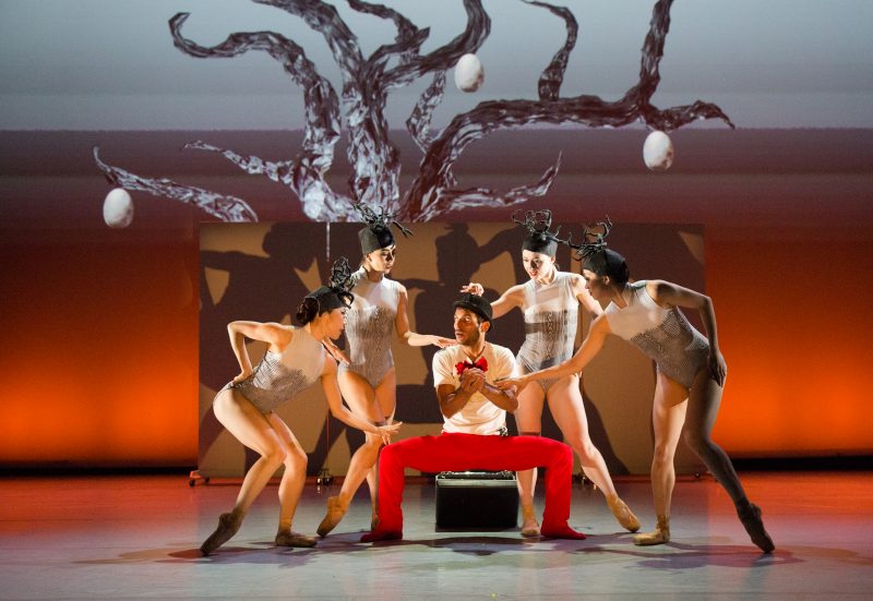 The integration of the visual and the visceral was particularly successful in “Bonzi,” whose titular character (dancer Edgar Anido) is a traveling salesman who leads a humdrum life trying to sell people things they neither want nor need. At the start of the performance, the bowler-hatted Bonzi knocks on a plain white door and sets in motion a series of surreal vignettes involving multiple doors, bowler hats, apples, and eggs–all motifs familiar from the paintings of Magritte. Dancers hiding behind movable doors on casters swirled around the stage, dazzling poor Bonzi as well as the audience. With constant costume changes and the clever use of props, the dancers playfully shift personas from alluring coquettes with quixotic tree-like headgear circling around Bonzi, to a self-contained corps of dancers that largely ignores him. By the end of the performance, Bonzi seems to enter the dancers’ madcap surreal world, leaving behind his heavy black briefcase with unrestrained glee.