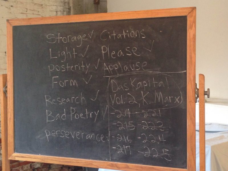 The first part was comprised of a reading of what appeared to be a relatively abstract monologue of a fictional artist’s negotiation of the removal and storage of his/her work; this reading was accompanied by an interaction with a blackboard on which a number of terms such as “posterity,” “perseverance,” and “applause” were consecutively ticked when Grilli came to the adequate moment in the narrative. The second part consisted of a reading of a prose-poetry text. The text was a story that appeared to depict an individual’s reflections on the possible arrival of a lover or friend. The third and final part of Grilli’s performance returned to the first reading but with a significant difference of emphasis—the fictional artist no longer recounts his/her experience with a removal company but reflects on the experience itself via reference to Karl Marx’s Capital.