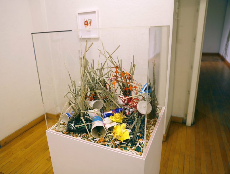 Brian Richmond pays homage to an ecologically conscious theme. Richmond’s trompe l’oeil dioramas of debris are very convincing. When one is informed that each element in the dioramas are all meticulously painted by hand, from cigarette butts to crushed soda cans, a eureka moment is experienced. Noting the debris that litters our roadways, beaches, and wetlands, he painstakingly paints the residue of human carelessness–soda and beer cans, cigarette butts, and assorted paper wrappers from picnic leftovers found across these landscapes. His small-scale dioramas made of sculpted paper and resin, and painted with acrylic are carefully encased and are reminiscent of beach fronts replete with tufts of marsh grass.