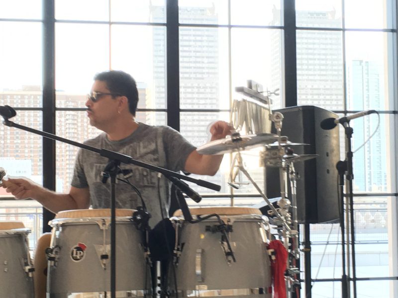 Congas, bongos, timbales, cowbells and cymbals–Batista moved seamlessly among them, accompanied by the skilled musicians of his Latin Jazz Ensemble, including Erik Johnson on drums, Chico Huff on bass, Jason O’ Mara on saxophone, Marcell Bellinger on trumpet, Nick Lombardelli on trombone, and Dennis Guevara on keyboards. Batista and his group were also joined by vocalist Carol Riddick, who performed a slowed down, vocally ornamented interpretation of “Summertime” unlike any version of the classic Gershwin song I have ever heard. Overall, this was a virtuosic yet completely accessible performance of Latin jazz, and the setting on the fourth floor of the Free Library overlooking the city skyline at sunset made for a memorable experience, on many sensory levels.