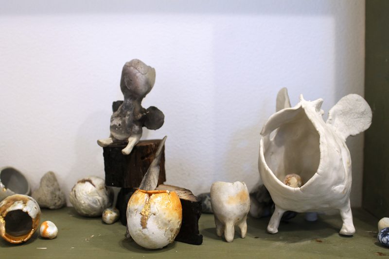 Many other artists in this exhibition have fascinating work as well, such as B. Monser, who fills a found shelf with various organic objects and little creatures which have been dutifully hollowed out into delicate vessels. Tammy Byerly’s “Cute Shapes and Words” provides an assortment of colorful polygons that explore the many different, yet astoundingly similar shapes the artist can concoct as variations on a theme.