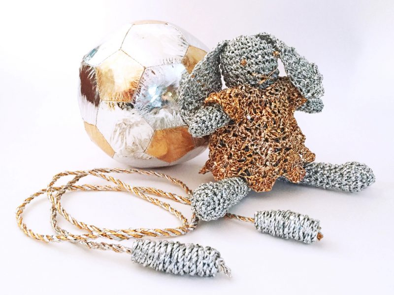 Two works by Cindy Lu use gold and silver mylar emergency blankets to further address the themes of shelter and safety. When do mylar blankets appear in our lives? We get them from people who want to calm us down, to put an end to our hysteria and fear. Notably, Lu’s Play, consisting of simple toys — a stuffed rabbit, a soccer ball, a jump rope — asks whether childhood itself is a security blanket of sorts, whether we use nostalgia for an imagined past as a way of comforting us and distracting us from an undesirable presence.