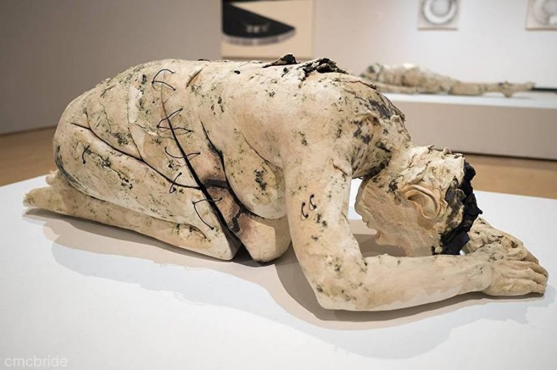 The most striking and thought-provoking work in Shelter is Constance McBride’s Truth From Within. A prostrate human figure about two-thirds life size is built from cracked and jagged layers of ceramics stitched together with wire. Walking around the sculpture, one notices that the figure’s skull has been cracked open and the top of its head is missing entirely; the emptiness inside has been left a burned-out gray-black color. The pose of the figure recalls prayer, but judging by the utter disrepair of the body — skin sloughing off, the lower body connected to the torso with mean-looking loops of black wire — prayer has proven not to be enough. Truth From Within asks whether faith and prayer can be an adequate form of shelter, or whether they serve merely as a bandaid for endless suffering.