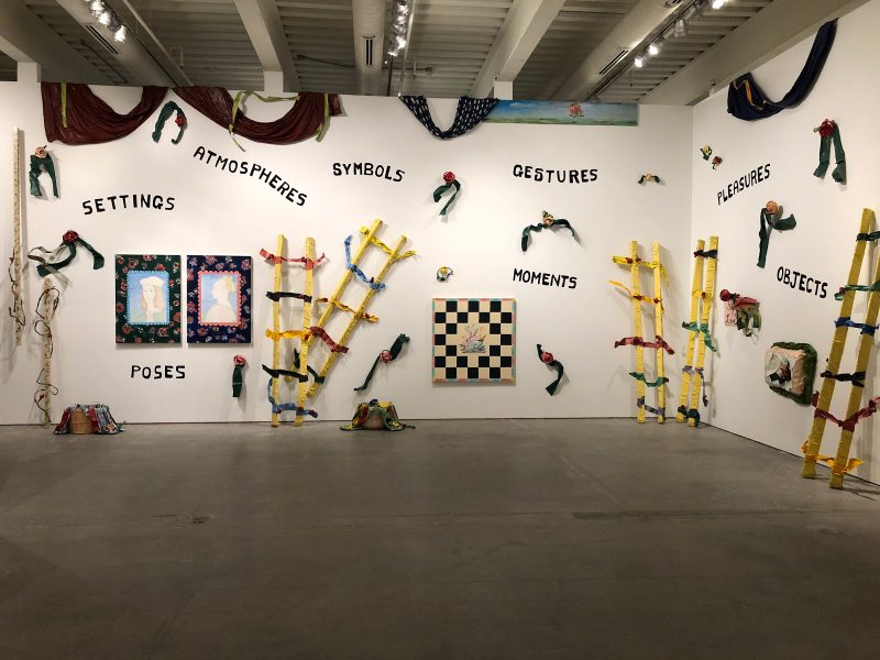 The installation, Signs of Love (‘76), spans two large walls and contains a range of materials including acrylic, oil, watercolor, pastel, colored pencil, and a significant amount of felt. This is both the largest and arguably most complex piece in the exhibition. It includes various objects, from small paintings and sculptures to large yellow ladders and dark, dangling drapes. Amidst these objects, black felt letters spell words like “pleasures,” “gestures,” “moments,” and “settings.” Ironically, these words represent a variety of ways in which love can be expressed nonverbally, prompting viewers to consider how they demonstrate love in their own lives.