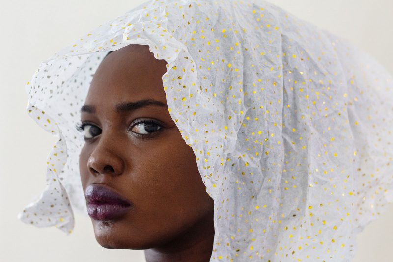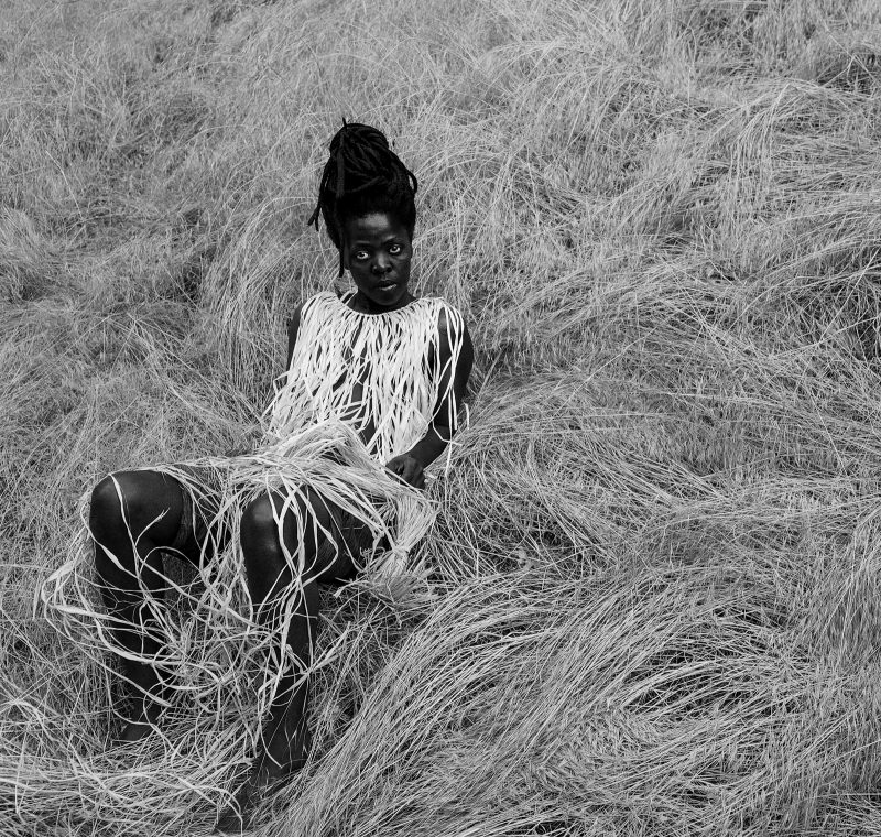 Muholi is a world renowned photographer who has primiarly focused creating portraits of black LGBTQ people. For this residency they have continued their recent practice of turning the camera around and making self-portraits. Muholi’s signature style remains; every photo is black and white with their skin made into a deep black. Their eyes, which are always meeting the viewer in a mutual acknowledgement, are focal point of each photo. Muholi often transforms their body through adornment. In “Sizwe I,” Philadelphia, they wear an outfit made from the long grass that fills the field in which they lay. Propping themselves upright, Muholi gazes defiantly as their body melds into the waves of grass. Similarly, Qampi utilizes adornment in her self-portraits. In her series, “Inside My Heart,” Qampi has fashioned clothing out of recycled materials to communicate the strength and dignity that can be found in people who have been harmed by violence.