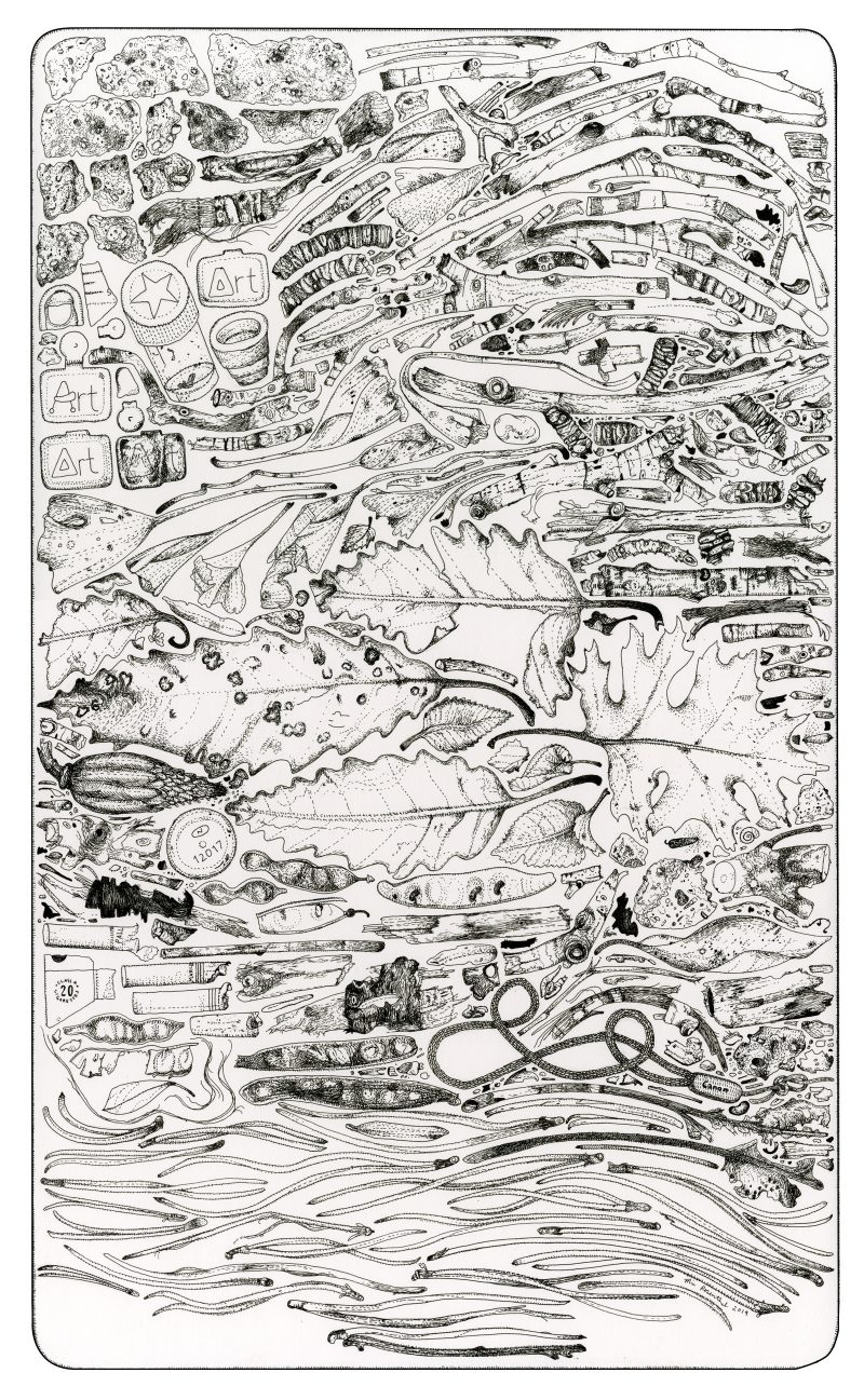 While some of the works in the exhibit deal with macro, big picture issues, some delve into the incredibly specific — like trash found in Philadelphia. We’ve traveled from looking at the sky through naked eyes, through a telescope, and into looking for answers with the internet: In three works rooted in the specific instead of the general, Rosenthal observes and draws the found objects in particular Philadelphia locations. The linework in “Found beneath the Septa Railroad Bridge,” “Found outside the Philadelphia Museum of Art (west steps, winter),” and “Found at Mt. Airy Playground” is bolder, more sustained, and less fuzzy than in the previous works, snapping the detritus at these three spots into perfect clarity. So what can we learn from the things Rosenthal found on the ground? “Septa Railroad Bridge” consists of mostly twigs and rocks–natural outdoor/landscape remnants–intermingled with the occasional Coke can opener tab, a flower hair clip, bottle caps. “Philadelphia Museum of Art” balances the natural and manufactured materials, juxtaposing large leaves with the museum’s small metal admission badges, while “Mt. Airy Playground” is more evidently cluttered with litter: amidst the gingko leaves are paper clips, keychains, a Barbie doll’s arm, a razor blade, and a repeat of the bottle caps and flower clips of the adjacent drawing.