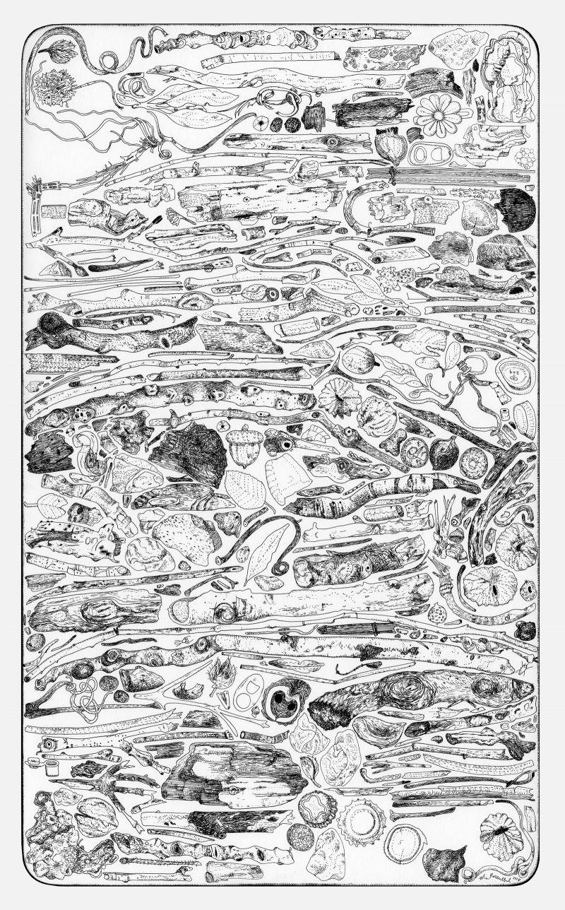 Everyone looks at the sky; many people use Google Images; some people enjoy cave paintings, but no one looks at the crap left on the ground. With the final three drawings, Rosenthal honors her home of Philadelphia, creating an orderly taxonomy of the things that no one looks at, devoting as much detail and attention to trash as to starry night skies.