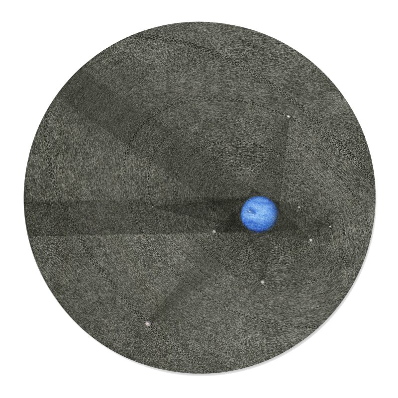 The artist suggests inter-planetary connections in two round drawings that form a vertical diptych. At the top, “Gravitons: Neptune and Moons” shows the blue planet rendered in blue ink against that velvety, densely drawn sky. The eponymous moons are only marginally larger than the negative-space stars, and are linked to one another in a warped star-shaped pattern by virtue of darker sections of mark-making. “Collider,” at first blush, is a more empty composition: like a spherical value drawing you do in art class to learn how shadows work. But stepping back, you see the inclusion of a dark ring drawn outside the edge of the round composition, creating two concentric circles. The drawing’s effect, especially mounted within the round, white frame, is that of a telescope lens, like “Collider” is a representation not just of the sky, but of how humans can observe and study the sky–with a telescope. The piece’s title nods to the Large Hadron Collider, which allows scientists to simulate the first seconds after the Big Bang created the universe.