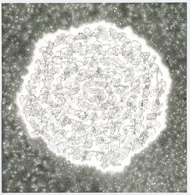 “Life on Earth” presents a cluster of carefully-labeled Earth species circling in a spiral, connected to each other, on a bright gaseous planet or star surrounded by tiny points of light in a roiling gray sky. Looking closer at this tondo-like piece, you see the incredible detail and craftsmanship at Rosenthal’s command: each plant and animal is rendered in thin black ink, while the hatched and stippled sky surrounding them must be the result of infinite patience and faith in one’s steady hand. Rosenthal jumbles together the past and present, placing dinosaurs and prehistoric mammals right alongside recognizable pigeons and sheep, allowing us to take in the grand sweep of evolution and history in a single glance.