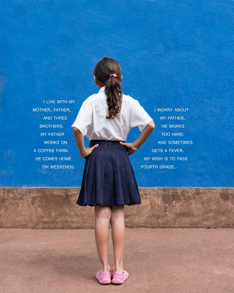 This brings us to at least a brief consideration of Judy Gelles’ most ambitious and far-reaching work: “The Fourth Grade Project.” ***What began as an outgrowth of a volunteer project by her synagogue, to help improve reading skills of disadvantaged Philadelphia fourth graders in a public school, became an international project which occupied Judy for most of the last decade of her life, producing an unprecedented body of work that deserves its own extensive discussion. Here is a brief description: “Over the past decade Judy Gelles has interviewed and photographed more than 300 fourth grade students from a wide range of economic and cultural backgrounds in China, Dubai, England, India, Israel, Italy, Nicaragua, St. Lucia, South Africa, South Korea, and multiple areas of the United States. She asked all of the students the same three questions: Who do you live with? What do you wish for? What do you worry about? The Fourth Grade Project connects children locally and globally, building bridges and tearing down walls.”
