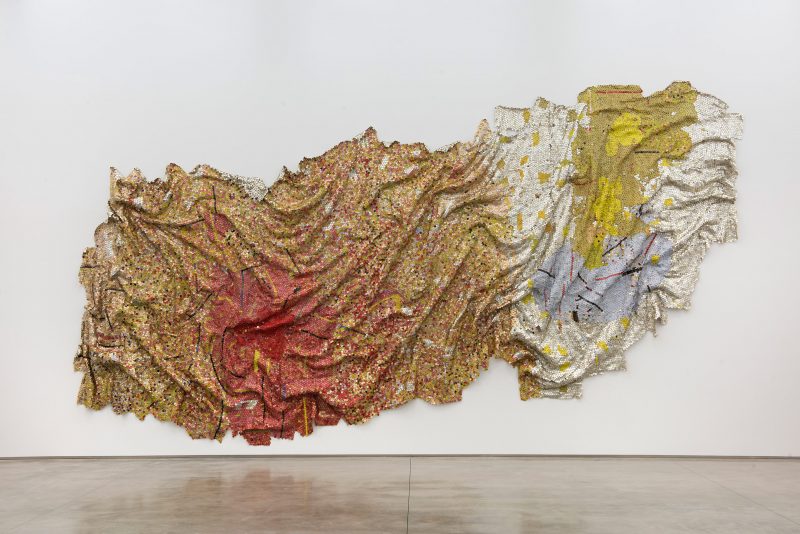 Anatsui’s mesh, hanging works offer no installation instructions; it is entirely up to the owners, curators and art handlers to decide which side is the top, at what height and angle a work will be hung, where the mesh panels will be bunched, crumpled, and folded and whether the wall-based work will extend onto the floor. What any viewer knows of a work – in the original or in reproduction – depends entirely upon where it was installed – hence, what the authors term “metamorphic form.” This is an unprecedented concept modern sculpture. The work has never been stretched flat against the wall, as large textiles are displayed; while the artist was influenced by the modular designs of West African textiles, he always conceived his work as sculpture. The authors also situate Anatsui’s contingent forms that are based upon communal activity within philosophical traditions of West Africa and his experience of ritual objects which change with repeated use.