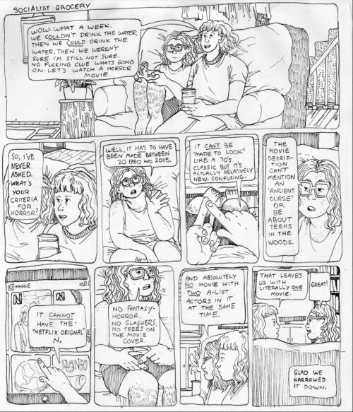 In a 9-panel comic from the Socialist Grocery series by Oli Knowles, Maggie, Sebastian’s partner exasperates, “Wow. What a week. We Couldn’t drink the water, then we could drink the water, then we weren’t sure. I’m still not sure. No fucking clue what’s going on. Let’s watch a horror movie.” While sitting on a couch next to a gaming Sebastian.