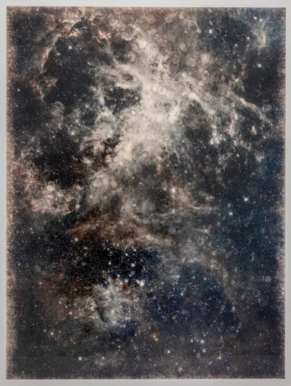 For Infinities, he starts with images from the Hubble space telescope and then overlays these views with natural details from our home planet, such as flowers, snowflakes or molds. The works call for contemplative meditation, as the macro and the micro meld together. We humans are but tiny pieces of dust in the cosmos, he seems to be saying. But each of us contains multitudes.