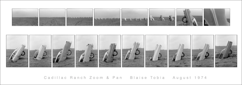 Tobia’s photographs comprise a unique documentation of the Ant Farm’s Cadillac Ranch, a series of 10 Cadillacs positioned nose-down in the ground alongside Interstate 40 in Amarillo, Texas. Now graffitied and strewn with trash, Tobia photographed them in near-pristine condition, shortly after their installation in 1974. Titled Zoom and Pan, the photographs form a sort of filmic panorama, in the sense that they emphasize the movement of both the camera and the cars themselves. Tobia calls his approach “structured documentary.”
