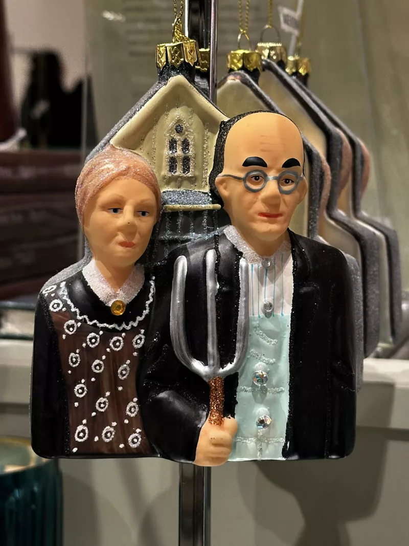 To get to the main gift shop at the NGA, you have to traverse an underground tunnel with one of those moving walkways you find in airports. Once on the other side, you pass by a small food court, another mini-gift shop and, eventually, the main Gallery Shop, where Rothko merch is in full swing. But it’s also the holiday season, so there are plenty of holiday gifts for sale. For $35.00, you can purchase a Christmas tree ornament in the shape of Robert Indiana’s iconic “LOVE” sculpture from 1964, or another one in the shape of the farmer and his wife from Grant Wood’s “American Gothic” (1930).