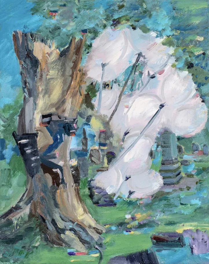 The pursuit of freedom seems to underlie and animate so much of Elizabeth’s art. This understanding crystalized during our conversation when Elizabeth talked about how she prefers landscape to figuration. “My paintings are mental constructions expressing escape from people and their voices. I prefer landscape to portraiture or interiors. I have a deep need to see open vistas, sky, and fields. Every painting in this show includes open areas of abstraction that offer respite from movement and change. Juxtaposing abstraction with recognizable objects signals that you are looking at an imaginary, internal space. To me the paintings feel busy but quiet, but viewers might feel differently.”