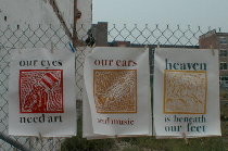 The thing about the groups of artists clothespinning work up on the fence is they enliven the street and offer something almost everyone can afford. In fact, I was on my way to one of the group shows when I was waylaid by the outdoor art-on-the-fence.
