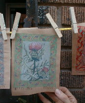 Suzanne Francis (see above image) was selling her little Indian miniature-like illuminations of flora and insects for incredible prices–$7 to $10 for medium-size ones, $12 for large, and $15 for framed ones. Such a deal. Such a steal. She stole my heart with them–and the hearts of numerous others, milling around her work and buying, buying, buying. She also had original collages on postcards for a standard picture postcard price of $1.50 apiece.