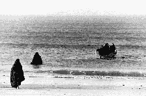 Another video artist who comes to mind with his slow imagery is last year’s darling, Jeremy Blake (image here). His abstract images push the viewer to participate, to contemplate, to make up what’s happening. Even with real-world imagery, Neshat also forces you to make up what’s happening. The strengths in both artists’ work is in the evocative imagery and storytelling–open to interpretation and contemplation.