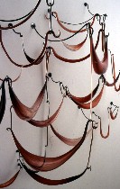 Graham Caldwell’s blown glass and steel **”Transversalis” (detail shown), it’s blend of delicacy and threat, skin, fabric and meat-hook suggestions taking over a gallery wall, was one of several surprises.