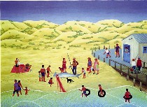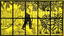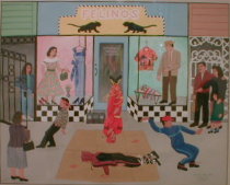 With delicate colors, rhythmic compositions, primitive (but sophisticated) solutions to perspective issues, and a sense of the magical, Lomas Garza uses guaches, oils and prints, as well as traditional Mexican paper cut-outs–and metal cutouts based on them (shown, metal cutout detail from Day of the Dead ofrenda to her grandfather, Antonio Lomas).