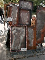 Safe art is not the only approach. P. Robinson-Smith (shown left) has an unusual, crafty thing going with wire screening. With an amazing amount of control over a fractious material, he’s making reliefs–mostly nudes and animals . Are people buying? He says , two or three a week–enough to bring him down from Vermont every other weekend. His prices? From $80 to $1,500.