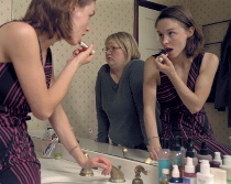 Davis, a plus-sized artist who poses herself alone or with another woman, treads on the concept of otherness and pulls it off nicely in images that ache with loneliness. (image left is Davis’s “Primping”)