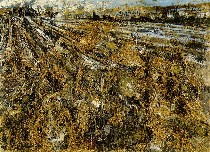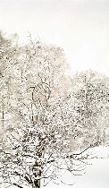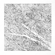 The image I was looking for was a relatively modest-size etching (I can’t tell you the exact size because the page isn’t working now, but it’s in the 20″ square range) called “Fallen” (shown above). Here, Brown seemed to be getting at something other than the transcendence of nature and man’s place in it. A turbulent nature menaces the white, fallen limbs, which seemed to me like human limbs, caught in the web of writhing tree parts.