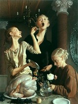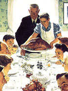 Rockwell, on the other hand, offers cloying sentimentality, which this time he hasn’t undercut with humor. He’s put the bird in its place, center but ignored by the guests, who are laughing together, paying no attention to the piece de resistance. Rockwell offers sanity, generosity and affection–he’s saying it’s all about the family relations, not the damn bird or eating.