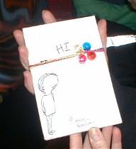 Familiar names whose books were noteworthy included Andrew Jeffrey Wright. His “Chest Hair Dance” (shown right) got a laugh out of me, and his psychedelic skulls books were, well, psychedelic. “Drum Solo,” a group project by Adam W.[allacavage], Rachel, Thom L.[essner] and Rose used postcards [leftovers advertising a Wright show] bound together with rubberbands. The face was transformed, the blank white eyes moving as the book flipped. Pretty funny.