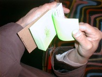 Other adventurous materials worth mentioning—nuts and bolts for bindings and decks of playing cards, the hands on the cards doing something like dealing.