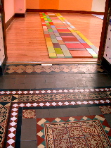 Michelle Oosterbaan’s installation at Pennsylvania Academy of the Fine Art‘s Morris Gallery slaps three painted plywood runways onto the floor. And while there’s also beaucoup d’paint on the walls and ceiling, it’s the floor that holds the power here. The artist’s plywood tiles speak to the floor tiles of the Furness building’s lobby and while the conversation’s not much more than a hello and a handshake, it’s a nice touch.