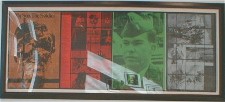 The prints were griddy images of youth and death. “My Son the Soldier” (top) and “My Son the Soldier (part II)” (shown right) were made in 1970, but they sent a shiver through me. Part I included a poem by Eugene J. McCarthy and images of military death–war photos, soldiers raising a flower instead of a flag at Iwo Jima, flag-covered coffins, a no more war poster, a skeleton with a ton of military bars, etc.