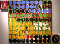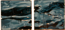 Bartlett’s paintings make the sea mundane and not sublime. And while these paintings are so big they must be experienced with your whole body, walking before them in a gallery they convey more about the installation of art in a gallery than about anything else. (image left is a new work, “Footnotes” 2003, note how abstract)