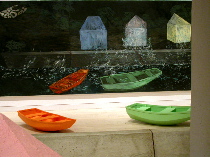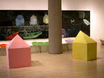 “Sea Wall” from 1985, the big night-time scene with little rowboats in the painting and on the floor in front of it is quite beautiful and if the boats are stand ins for people, you can read it as poignant — dark night of the soul and storm-tossed boats.
