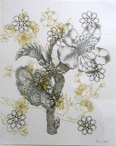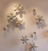 Blum’s flowers — ceramic, drawn and painted — are also on this side of manic — decorative but imbued with a kind of darkness, like Victorian exotica. Blum’s work reminded me of Rain Harris’s extravagent ceramic outpourings, seen recently at the Clay Studio.