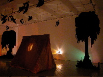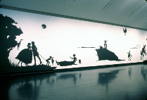 The room was dark and the lighting came from several small video projections and from the many small and one large cyclorama that cast flickering light and color onto walls, ceiling, floor and the props. A little pup tent reminded me of childhood and acting out plays in the backyard. In fact, the whole thing kind of reminded me of a stage set for children to act out stories. (Top image is Walker and below is one of Walker’s large non-linear narrative works, “Gone: a history of romance of a Civil War as it occurred between the dusky thighs of one young Negress and her heart.”)