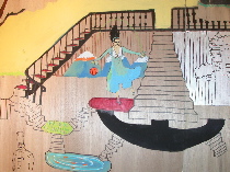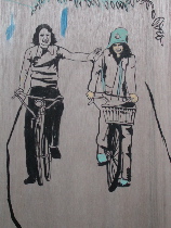 In the curated show in the gallery, Jessica Doyle, whose installation I had liked much at Project Room (see post of Nov. 30.) had a collaborative piece with Sarah Gamble that was similar to her previous PR wall drawings. Drawn and painted on thin sheets of unprimed plywood (that seemed to be curling away from the wall at the bottom), the piece is a kind of narrative of a life or lives. The ambiance is teen notebook doodle and the quality of the photo-based drawings is raw and straight-forward.