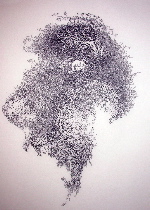 Jacobson, who is a kind of psychic map-maker, uses faces to create what look like lacy fragments of cloth, but drawn. These are not portraits, although the artist uses faces as a take off point. But her process — which involves xeroxing and degrading the image to the point of disintegration — takes the work to another zone. Then she works back into the face, coming up with beautiful drawings that suggest many things — from maps, to lace, to ghosts or x-rays or some computer-pixillated approximations. Shroud of Turn, maybe?