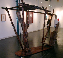 Leslie Kaufman’s large wood construction in the middle of the room held the space like a weird, Tiki surfboard throne. The dark, gnarly wood, the poles holding up the structure, the surfboard shaped floor, the suggestion of a chair, all came together to spell Hawaiian god or goddess on the move in calm seas.