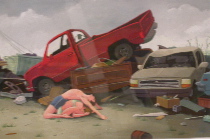 And Jerry Smith’s cool, small gouache paintings of crunched cars and entwined bodies evoked Philadelphia without having to say so — they had urban decay, gray skies, and vulnerable humans. (image is “Pile on.”)