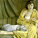 Then check out this amusing ancillary story that says a Freud postcard image (Girl with White Dog, shown) has knocked the pre-Raphaelite “Ophelia” (1851) by John Everett Millais out of first place in sales in the Tate Modern’s giftshop! Tate director Nicholas Serota implies the British citizenry has grown up in its art appreciation, calling “Ophelia” a striking image and “Girl” a challenging one.