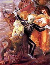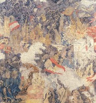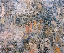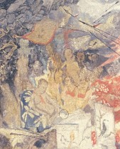 Unlike the usual acoustiguide experiences, with their lowest-common-denominator explanations, Zheng’s talks were scholarly and informative. The DVDs also contain a couple of excellent talks by Ji, himself–all of which helped pull me into the work, which for all its accessible iconography (the decadence, the cartooniness, the storytelling) is still quite obscure if you don’t know who’s who or are unfamiliar with the traditional symbols of Chinese painting (left, “The Forbidden City Ghosts” detail).