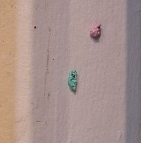 Angela Bulloch‘s “Chewed Gum,” 1998, (left is detail) eight pieces scattered around the room, each one nailed to the wall like a kind of medieval indulgence gone wrong — an anti-trophy — could be considered body-byproduct art. I consider it pretty silly.