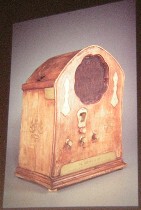 The work is also ritualistic. Words incorporated in the pieces and in the descriptions of the materials are incantatory; the materials are there for their magical and curative properties; the stories, available to initiates willing to undertake a study of them, are part of a belief system for raising the dead (left, “Vatican Radio” dedicated to Pope Pius XII, the metal from melted shrapnel, bone and bullets, the audio from a soundtrack calling draft lottery numbers, a woman’s gasp manified and echoed).